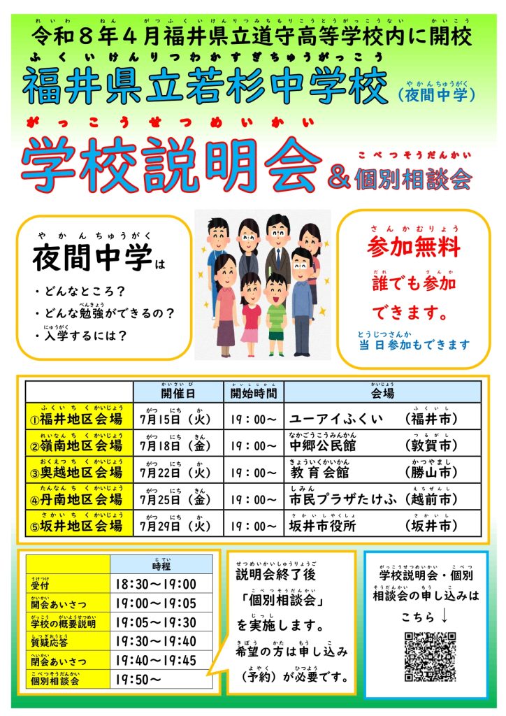 令和れいわねん月以降がついこう入学にゅうがくをおかんがえのかたに、個別相談等こべつそうだんとう対応たいおうをします。一度いちど若杉中学校わかすぎちゅうがっこうへお電話でんわください。(📞0776-37-3740