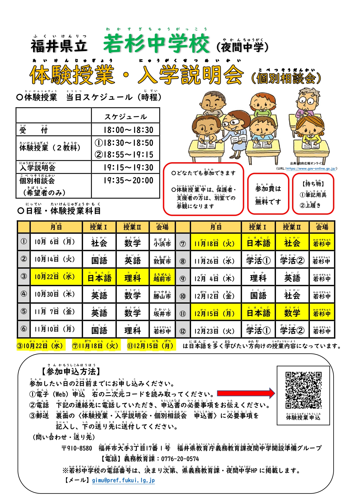 令和れいわねん月以降がついこう入学にゅうがくをおかんがえのかたに、個別相談等こべつそうだんとう対応たいおうをします。一度いちど若杉中学校わかすぎちゅうがっこうへお電話でんわください。(📞0776-37-3740